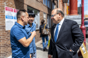 Sau cuộc phỏng vấn, Allan Domb hào hứng dạo quanh khu phố Tàu của Philadelphia và chụp ảnh trước cổng mái vòm mang tính biểu tượng của Trung Quốc. Nếu ông không vội vã đến sự kiện chiến dịch tiếp theo, bạn có thể đã thấy ông nói chuyện với bạn bè với một tách trà trân châu trên tay.
