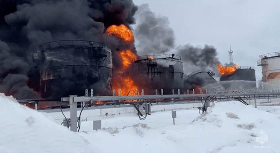 Các thùng dầu tại một cơ sở lưu trữ ở thị trấn Klintsy (Vùng Bryansk, Nga) đã bốc cháy sau khi quân đội bắn hạ một máy bay không người lái của Ukraine, Thống đốc khu vực – ông Alexander Bogomaz cho biết ngày 19/1.